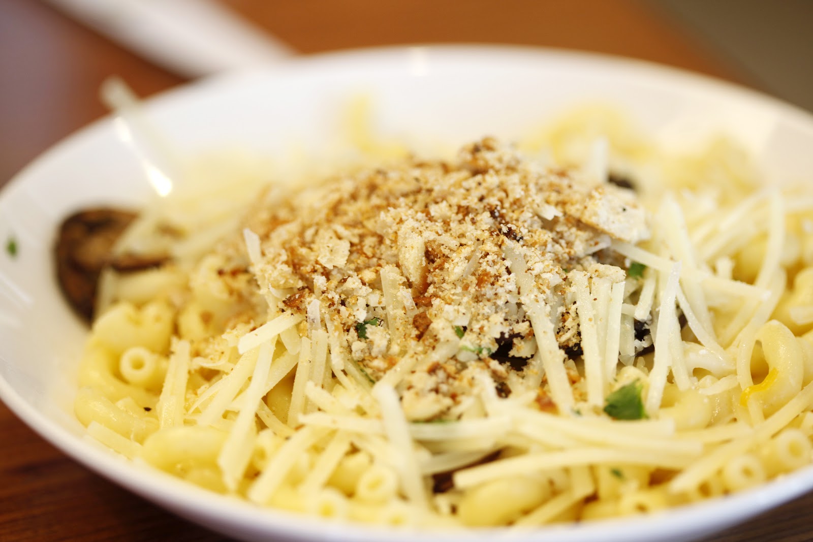 Curly pasta, basil pesto, garlic, mushrooms, tomato, wine, cream, parmesan and Italian parsley.
