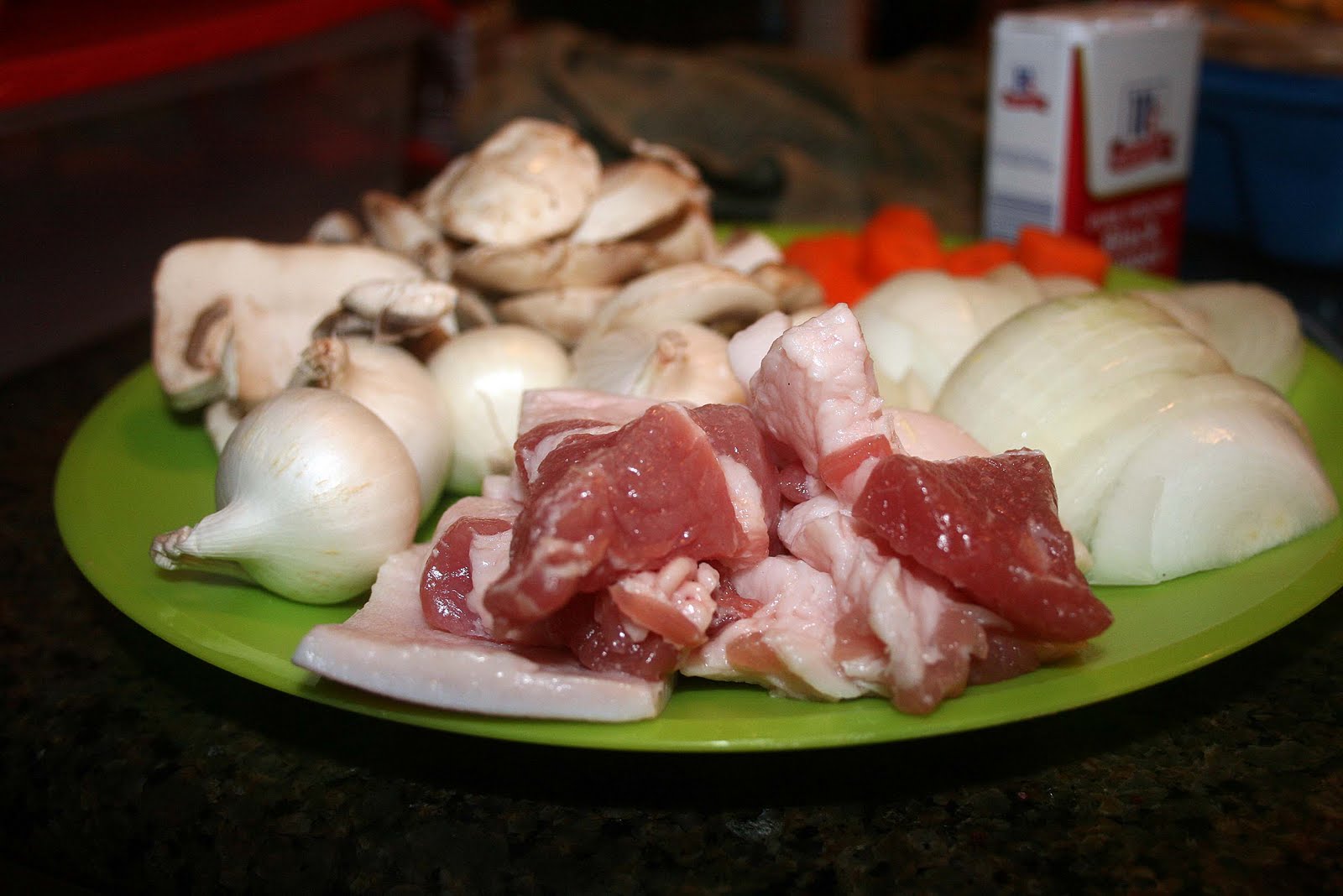 - While the beef is cooking, prepare the onions and mushrooms. Set them aside until needed.