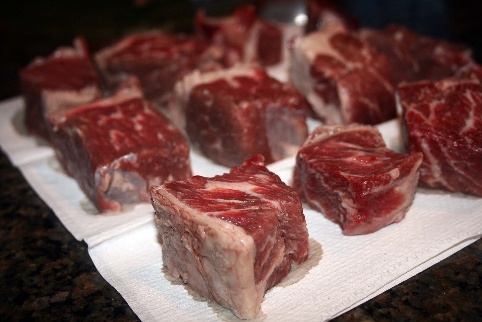 - Dry the stewing beef in paper towels; it will not brown if it is damp. Sauté it, a few pieces at a time, in the hot oil and bacon fat until nicely browned on all sides. Add it to the bacon.